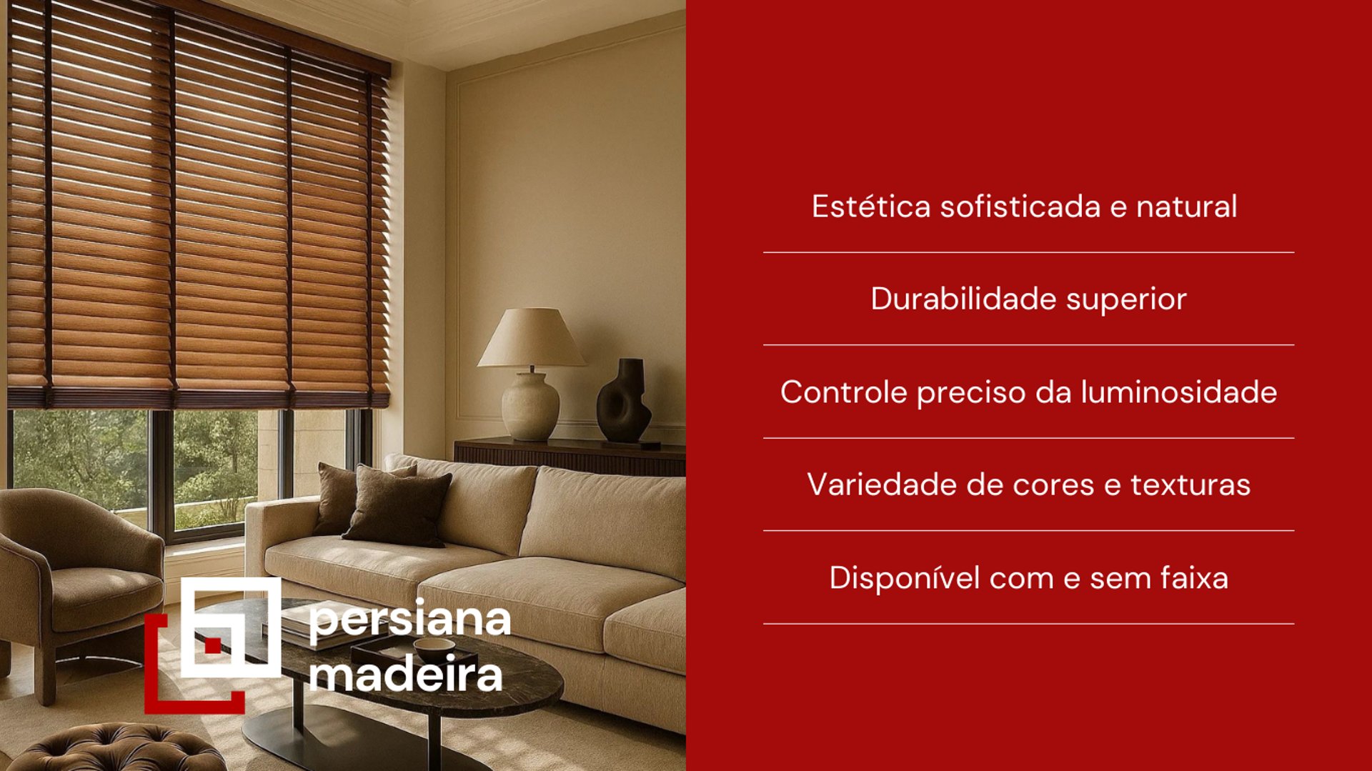 A Persiana de Madeira oferece controle preciso de luminosidade, além de trazer aconchego e privacidade ao ambiente. Suas lâminas em madeira natural permitem regular a entrada de luz com facilidade, criando diferentes efeitos e sensações ao longo do dia. Além disso, seu visual clássico e sofisticado adiciona personalidade ao espaço, valorizando a decoração e proporcionando um toque de elegância atemporal.