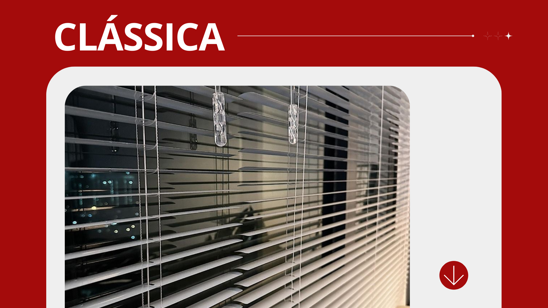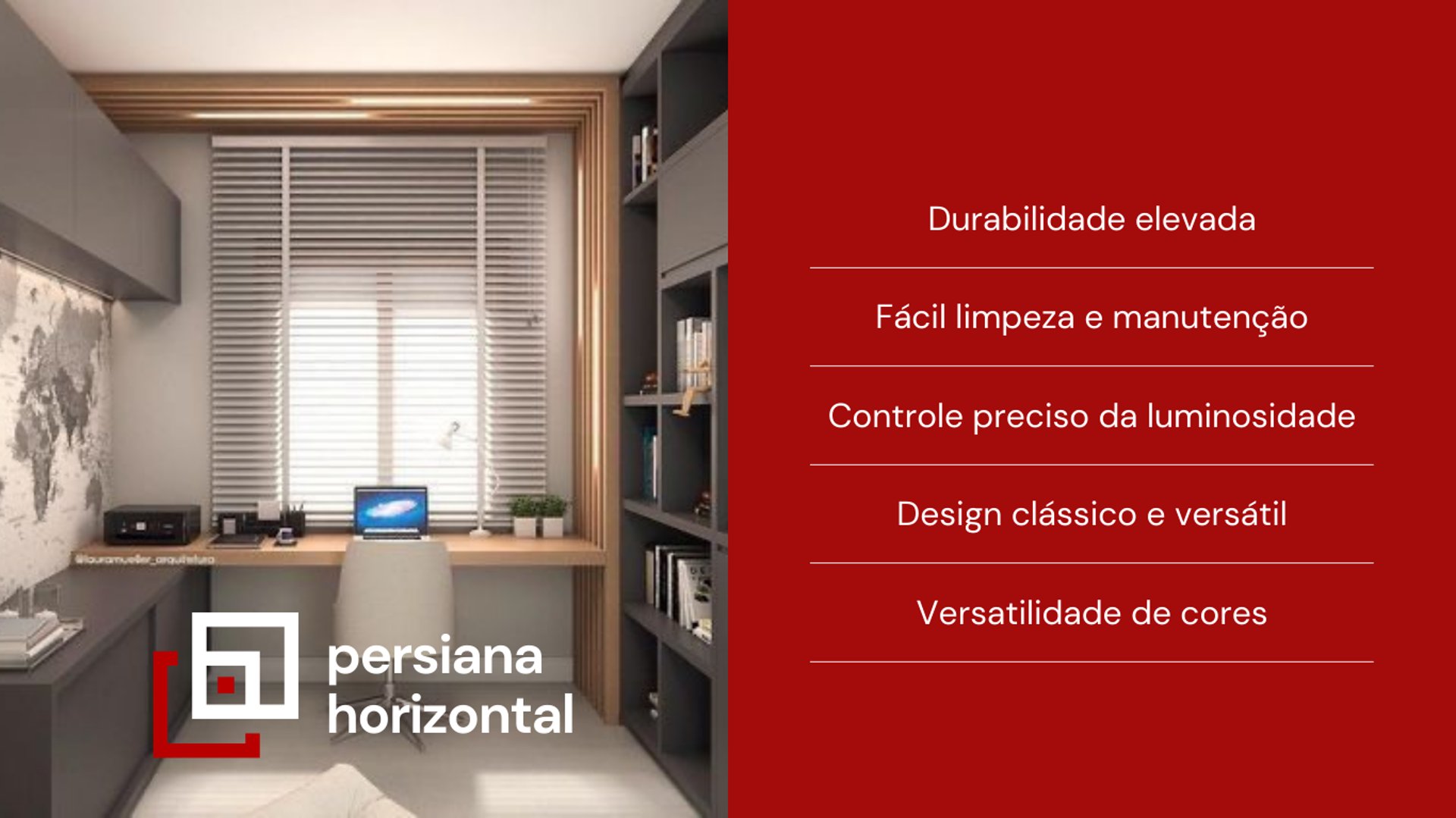 A Persiana Horizontal oferece controle preciso de luminosidade, garantindo praticidade e privacidade ao ambiente. Suas lâminas ajustáveis permitem regular a entrada de luz com facilidade, criando diferentes efeitos de iluminação ao longo do dia. Além disso, seu design moderno e clean combina com diversos estilos de decoração, trazendo elegância, funcionalidade e um toque atemporal ao espaço.