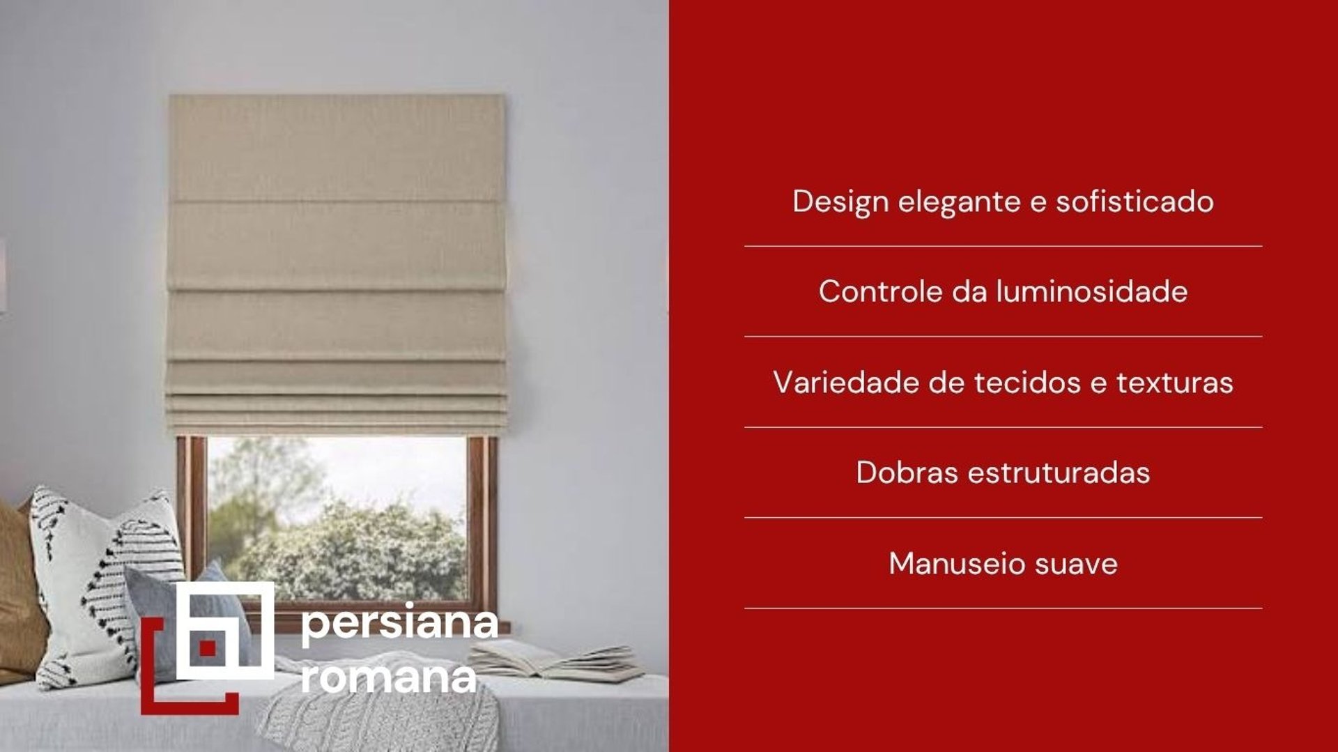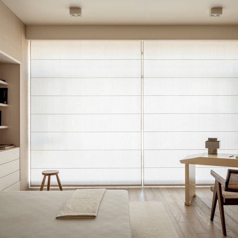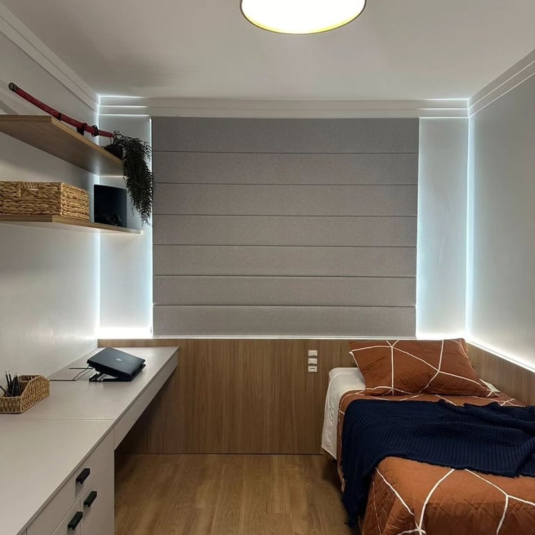 Em linhas retas e elegantes, a Cortina Romana se adapta com harmonia aos ambientes de estilo moderno. Ela pode ser produzida em tecidos com proteção solar, que ajudam a filtrar os raios UV, reduzindo o calor e a entrada de brilho excessivo. As versões decorativas oferecem texturas variadas que complementam a estética do espaço, enquanto os modelos blackout proporcionam escurecimento eficiente e maior privacidade.