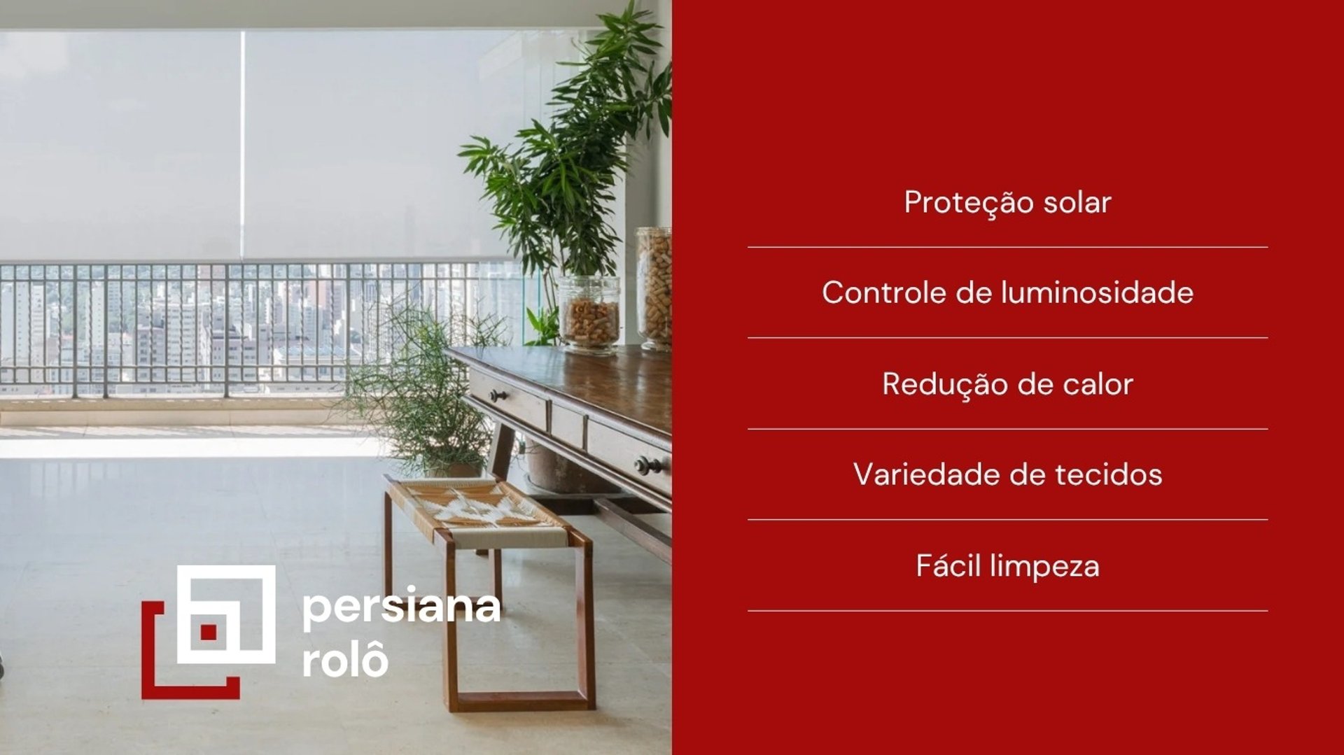 A Persiana Rolô é um modelo moderno e funcional, formado por um tecido que se enrola em um tubo na parte superior. Ela permite controlar a entrada de luz de forma prática, podendo ser feita em diferentes versões, como tela solar, translúcida ou blackout. Com design clean, é ideal para qualquer ambiente, garantindo conforto, privacidade e um visual elegante sem ocupar espaço. Além disso, os tecidos com proteção solar ajudam a filtrar os raios UV, reduzindo o calor e evitando o desbotamento dos móveis.